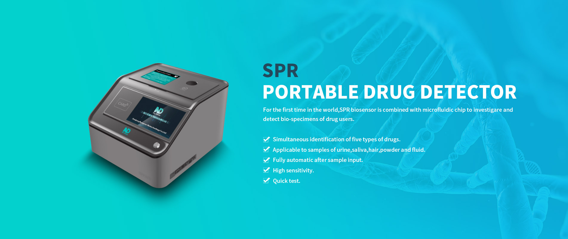 Rapid drug testing products are developed by ND independently. Passing rigorous inspections, ND products are approved by Ministry of Public Security and Police Electronic Product Quality Testing Centre.the company's self-developed hair drug detection technology and products are in leading positions in the market. The handy, easy-operated handheld and portable hair drug testing devices are easy to take samples, and can adapt to various testing environments. Multiple drugs can be detected, such as heroin, morphine, methamphetamine, ketamine etc. The reagent kit can be stored at normal temperature, thus, convenient for transportation and storage. The equipment is with supreme functioning quality, for instance, fast detection speed (within 5 minutes), high detection sensitivity (0.2ng/mg, in line with the standard of Ministry of Public Security), and strong thermal stability (tolerance to 45 °C).